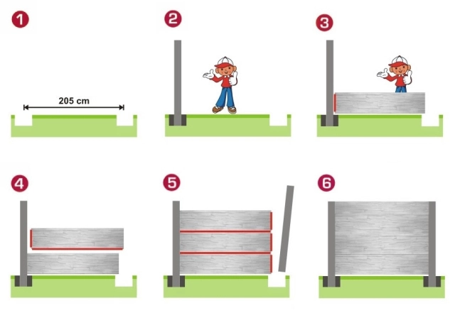 Po rozměření a vyhloubení děr již můžete začít se samotnou výstavbou plotu – nejprve se zabetonuje první sloupek, poté se do jeho drážky postupně umístí nad sebe jednotlivé desky, a nakonec se tyto desky přiklopí druhým sloupkem, čímž se vytvoří jedno ucelené pole plotu. Tento postup se opakuje až do dokončení montáže.